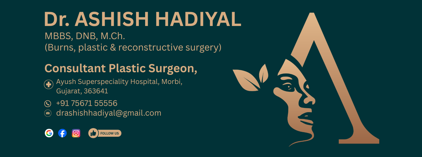 Dr. Ashish Hadiyal is a Board-Certified Plastic, Reconstructive, and Cosmetic Surgeon dedicated to delivering the highest standard of patient care with compassion, precision, and integrity. Hailing from a small village, Dr. Hadiyal’s inspiring journey from humble beginnings to becoming a skilled and accomplished surgeon reflects his unwavering commitment to excellence and service. He completed his M.B.B.S. from the prestigious M.P. Shah Government Medical College, Jamnagar, followed by post-graduation in General Surgery from MCD Hospital, New Delhi. Pursuing his passion for reconstructive and aesthetic surgery, he went on to earn his M.Ch. in Burns, Plastic, and Reconstructive Surgery from NHL Medical College, Ahmedabad. To further refine his expertise, Dr. Hadiyal undertook advanced Oncoplastic Reconstructive Surgery observership at Tata Memorial Hospital, Mumbai, followed by Microsurgery training at Ganga Hospital, Coimbatore, and specialized Cosmetic Surgery training in Hyderabad. His comprehensive training across premier institutions has equipped him with a wide range of skills in reconstructive, aesthetic, and microsurgical techniques. A strong believer in continuous learning and evidence-based practice, Dr. Hadiyal has published numerous articles in reputed national and international medical journals. His philosophy centers around providing personalized, high-quality care, ensuring every patient achieves safe and satisfying results. Dr. Ashish Hadiyal’s practice embodies his vision — to combine surgical excellence with empathy, helping patients restore function, enhance appearance, and regain confidence.